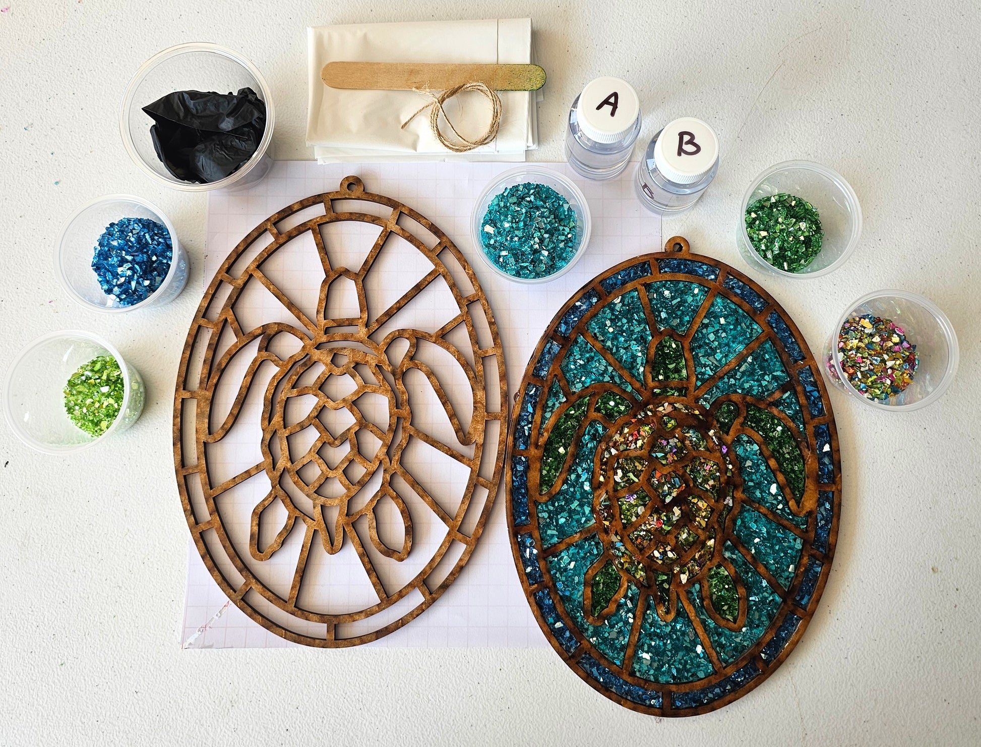 Crushed Stained Glass & Resin Art Kit to do in the comfort of your home. YouTube tutorial now available.