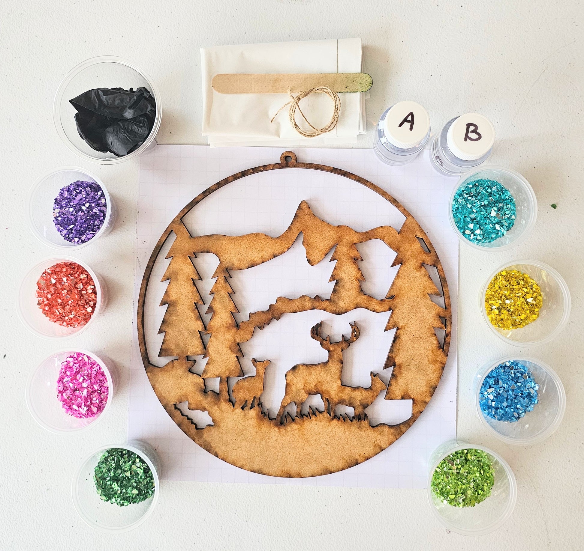 Crushed Stained Glass & Resin Art Kit to do in the comfort of your home. YouTube tutorial now available.