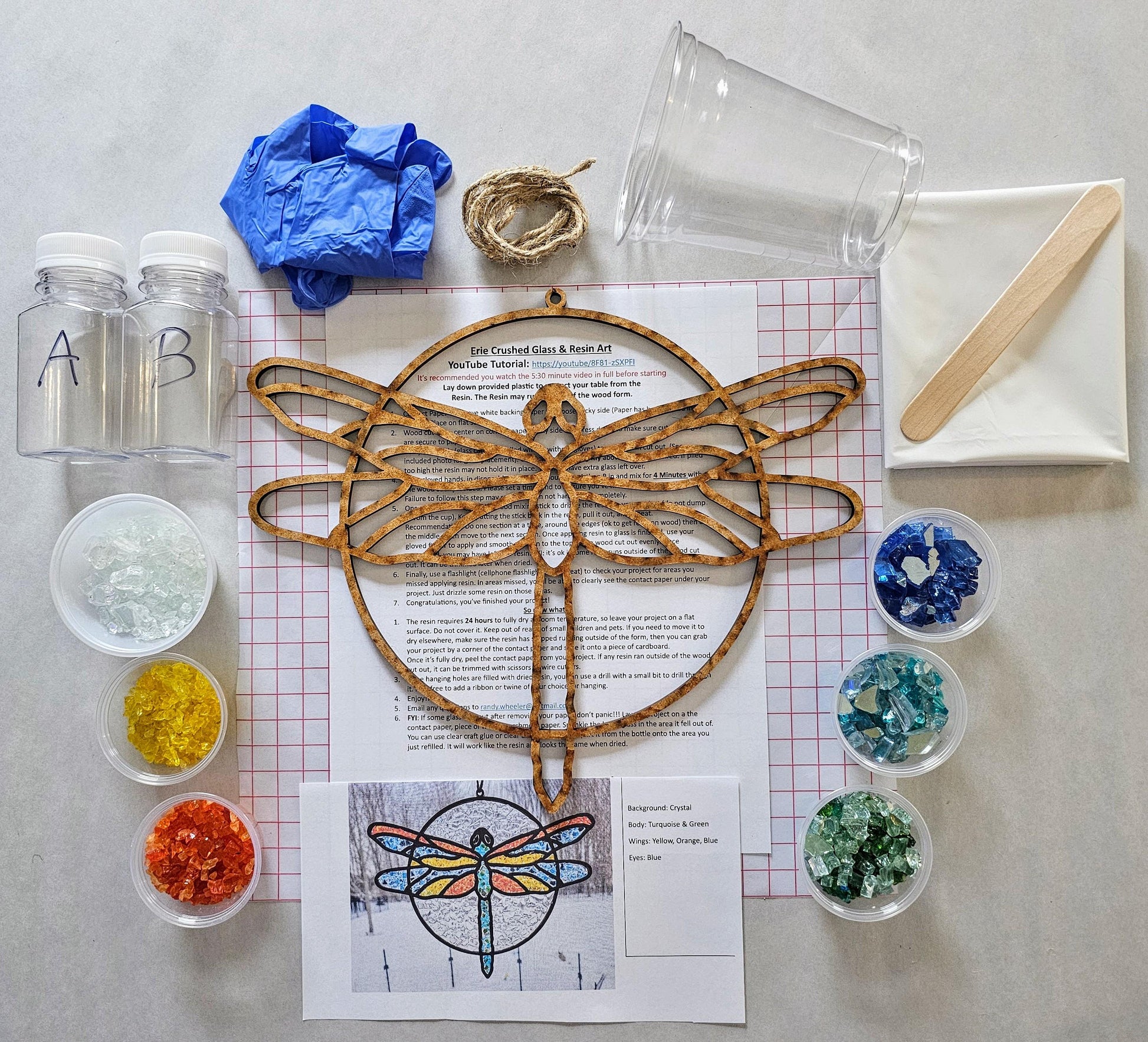 Crushed Stained Glass & Resin Art Kit to do in the comfort of your home. YouTube tutorial now available.