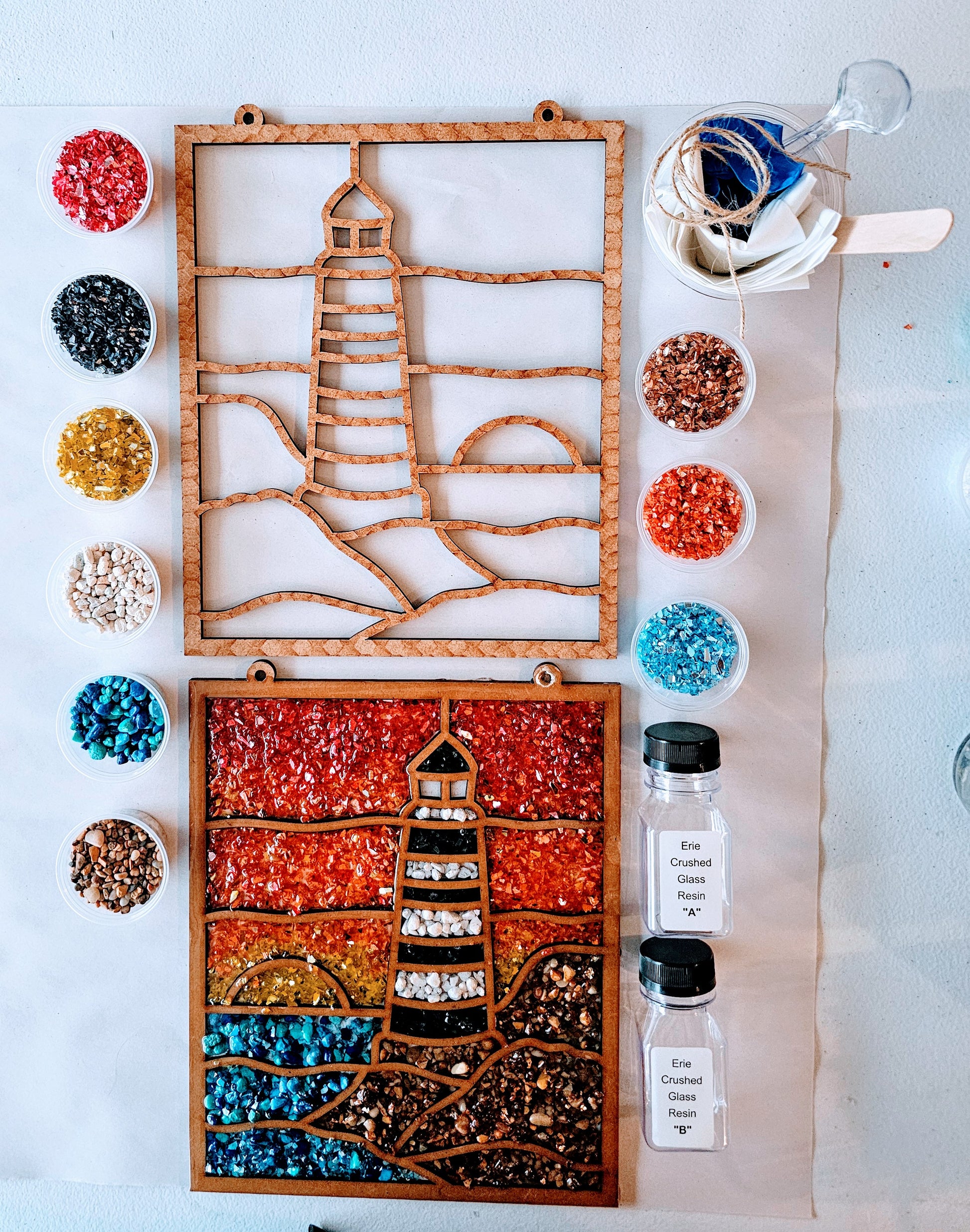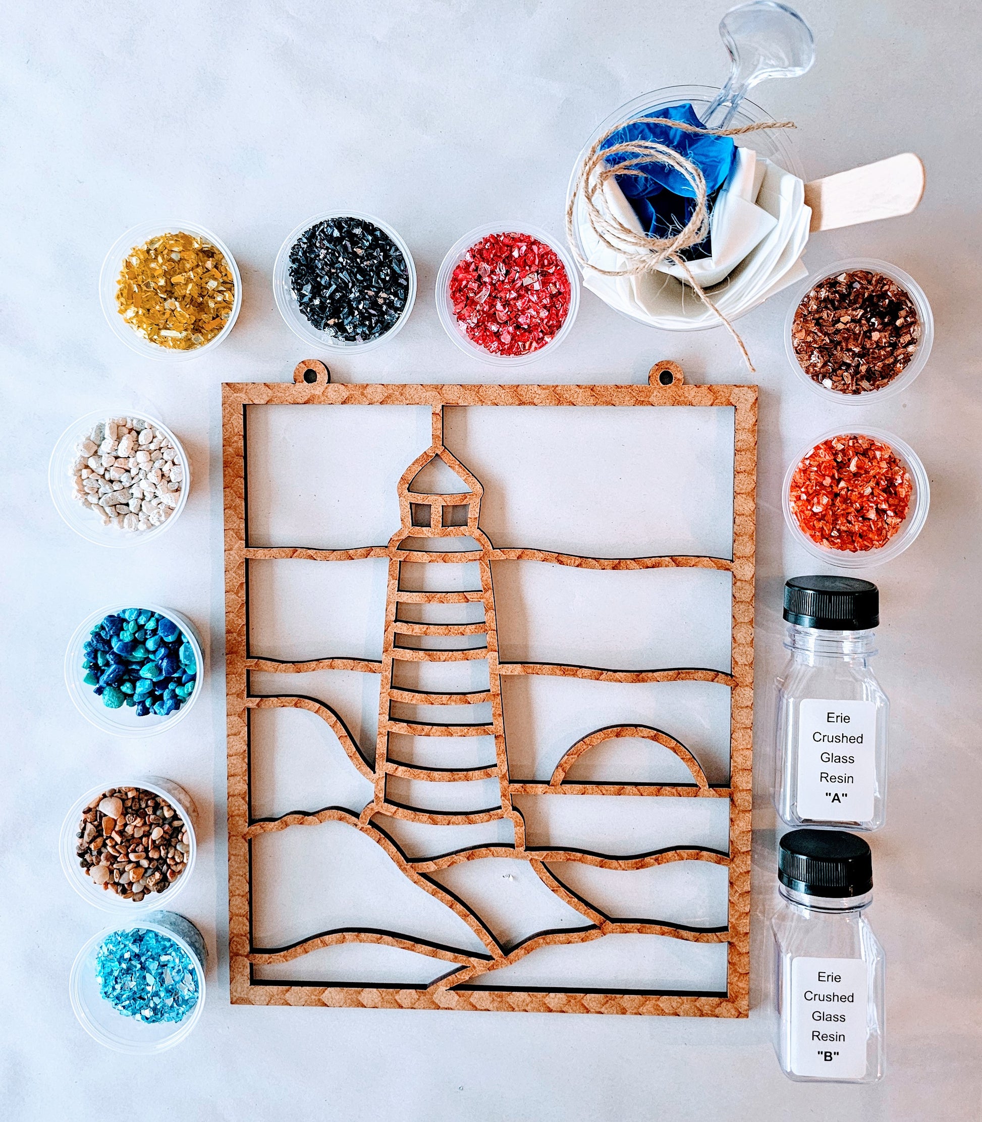 Crushed Stained Glass & Resin Art Kit to do in the comfort of your home. YouTube tutorial now available.